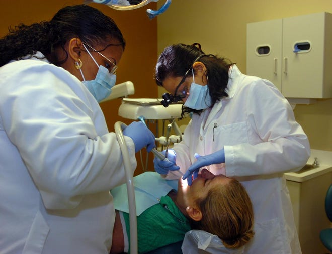 Elizabeth Wrightman And Maria Estronza Ramos Dental Assistant Trainees American Red Cross Dental Assistant Training Program Work On Dental Procedures During Chairside Instruction As Part Of The Eight Month Long Dental Assistant Training Program At